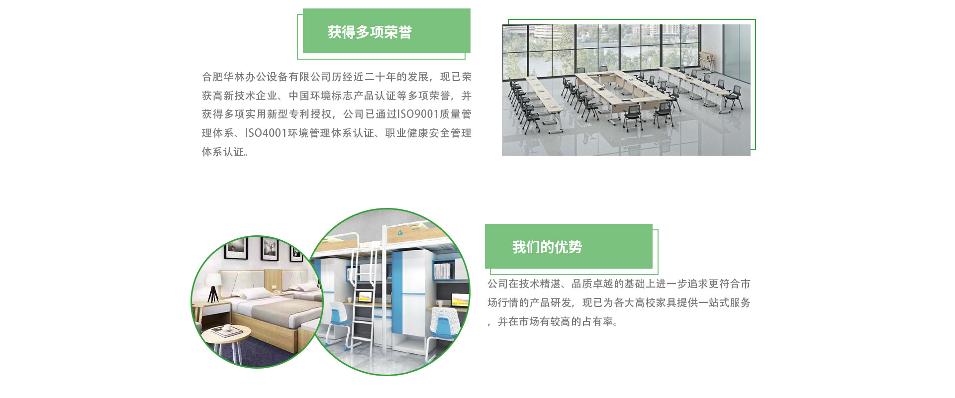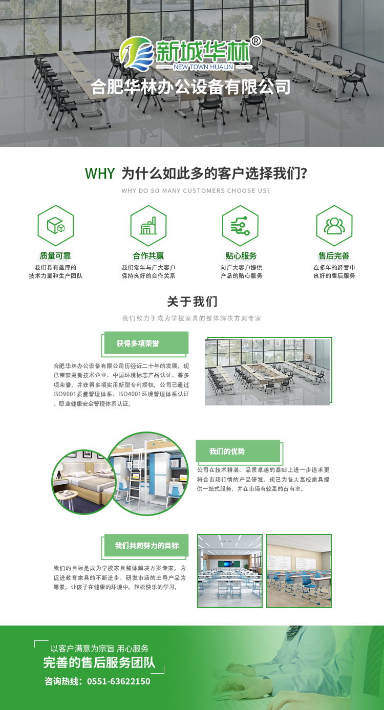 合肥華林辦公設備有限公司成立于2005年,是一家主要集教學課桌椅、講桌、實驗室錄播桌、智慧教室創客桌、公寓床、辦公家具等研發、設計、生產、銷售、安裝、售后服務為一體的專業型公司。公司不斷引進國外先進生產經驗,以強大的技術力量做后盾,緊跟潮流;有著多年的生產、安裝、維修經驗,擁有一支集設計、安裝、調試以及售后維修為一體的專業隊伍。本公司的辦公家具品種齊全,迄今已有八大類100余個品種、款式新穎,品質有保證。
